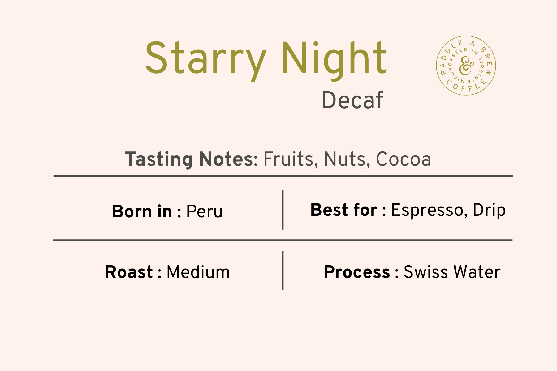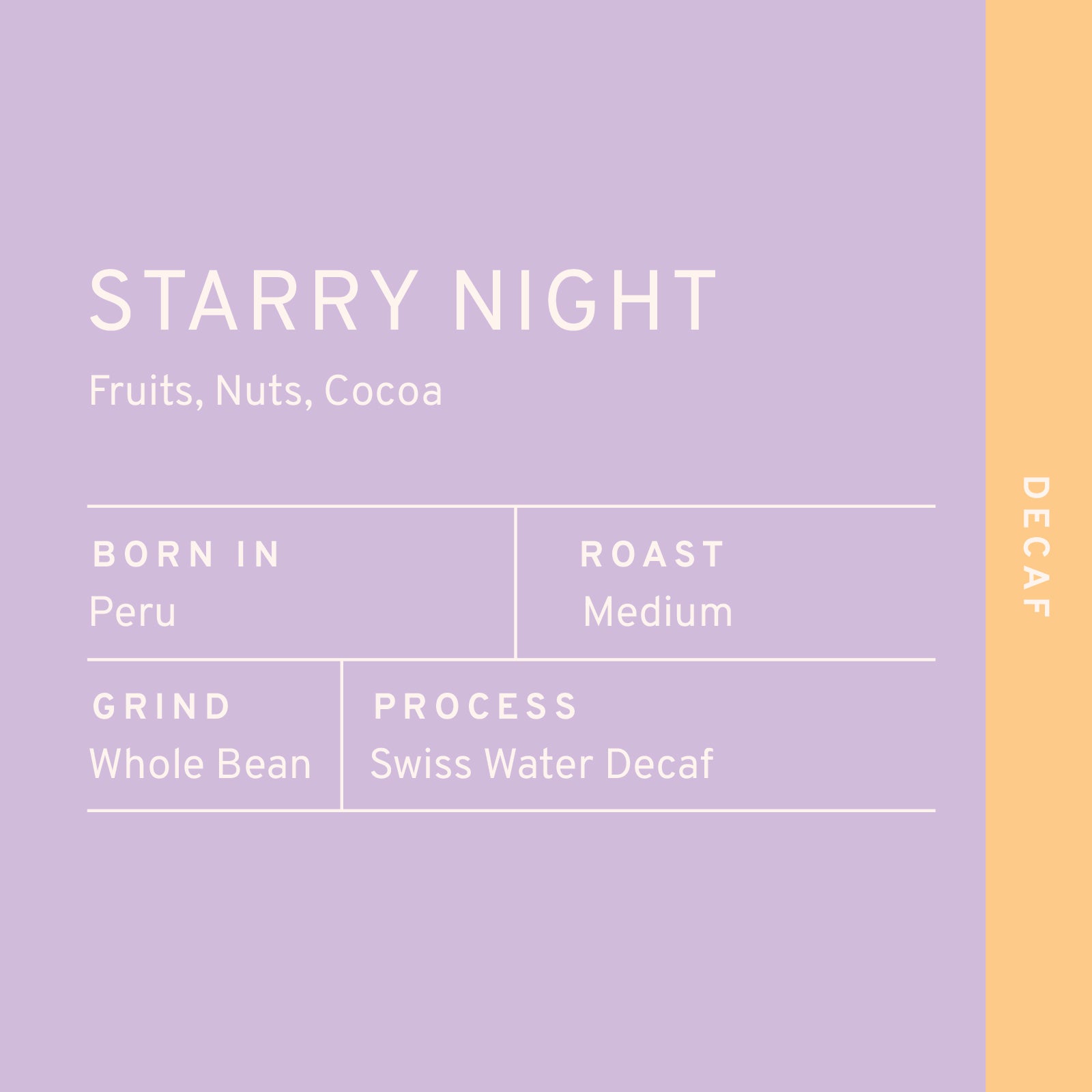 As twilight descends and the stars begin to twinkle, embrace the tranquility of Starry Night, a medium roast decaf that shimmers with the richness of cocoa and a whisper of fruit and nuts. 🌟