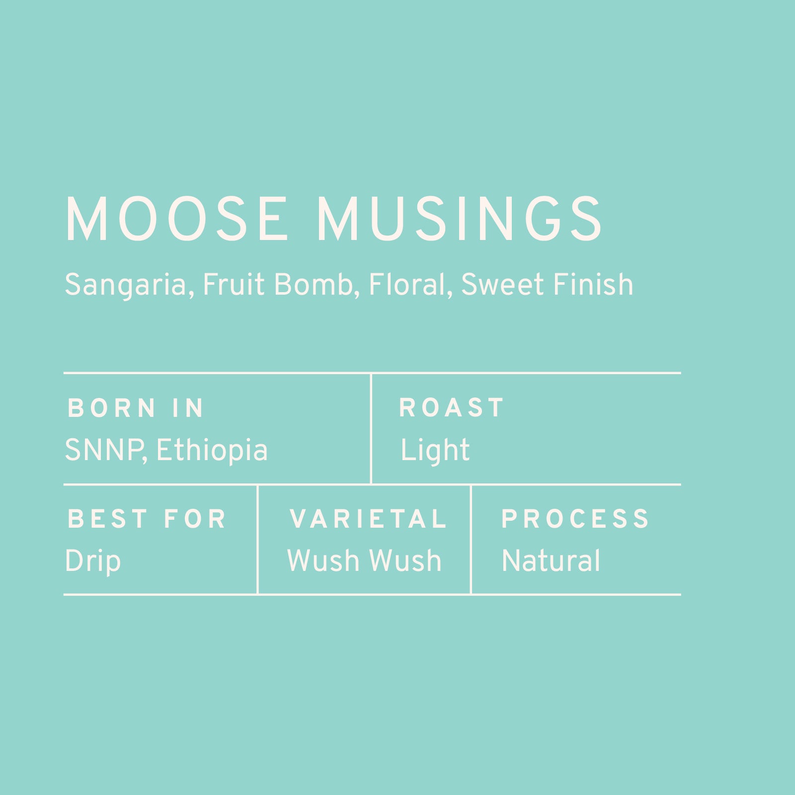 In the misty, high-altitude forests of Ethiopia's SNNP region, a whimsical alchemy unfolds to create The Moose Musing. This coffee is the result of a meticulously controlled, 120-hour dry fermentation process, a scientific dance that allows the cherries' natural sugars to break down and intensify. During this extended period, the coffee develops a complex aromatic profile, capturing the essence of its unique terroir.